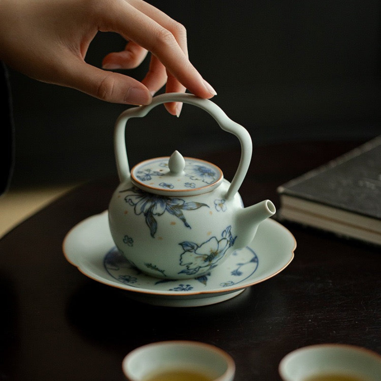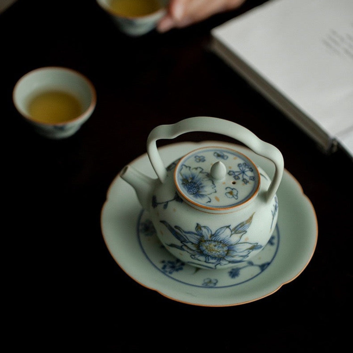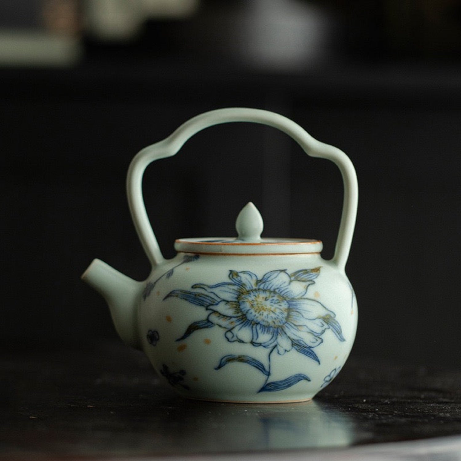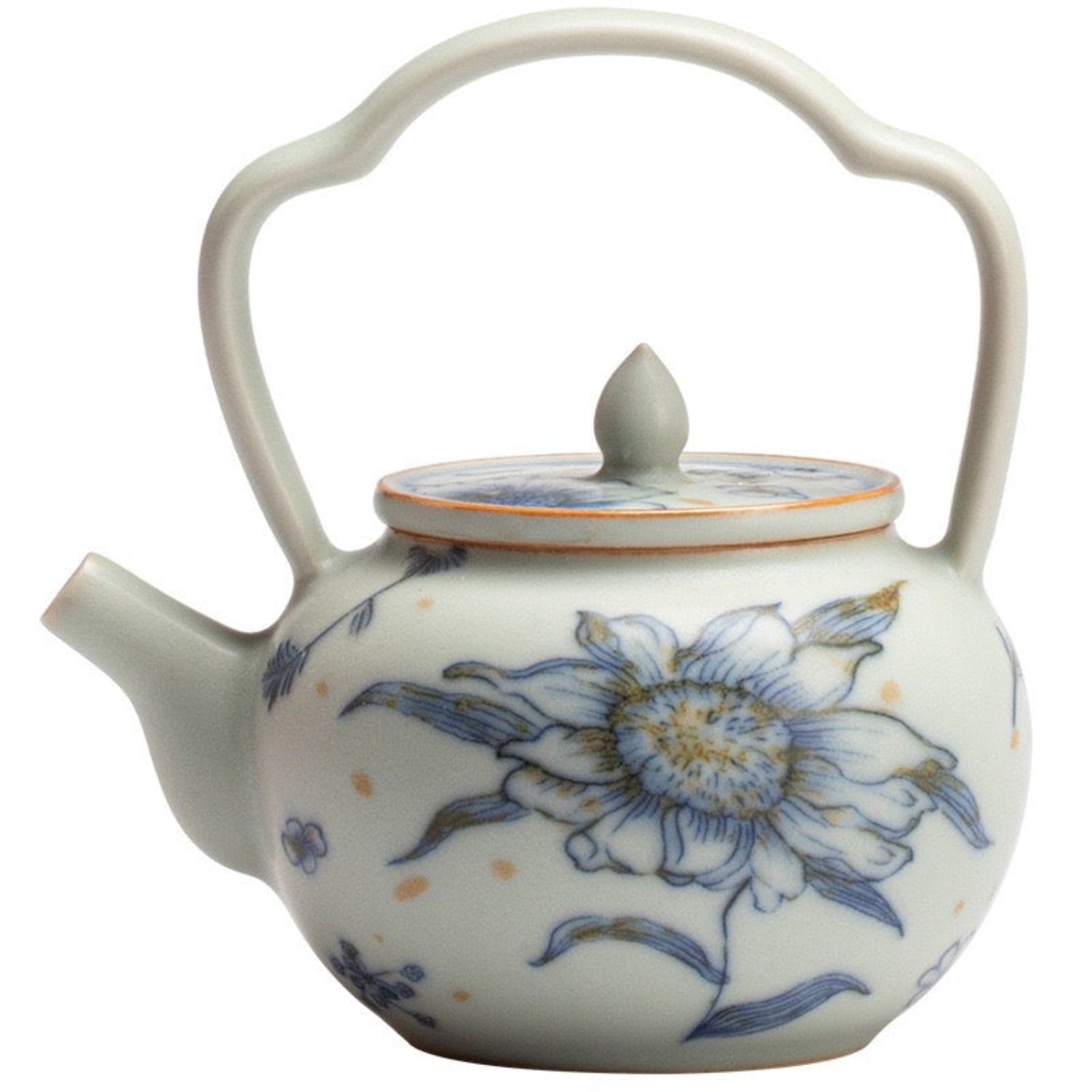 Táto keramická čajová kanvica vychádza z tradičného čínskeho tvaru tí liáng hú (提梁壶), ktorý je charakteristický svojou oblúkovou rúčkou nad hlavou. Povrch zdobia slnečnicové a kvetinové motívy v jemných modrých tónoch, doplnené zlatohnedými škvrnami, zatiaľ čo modrastá matná glazúra jej dodáva zamatový vzhľad.
