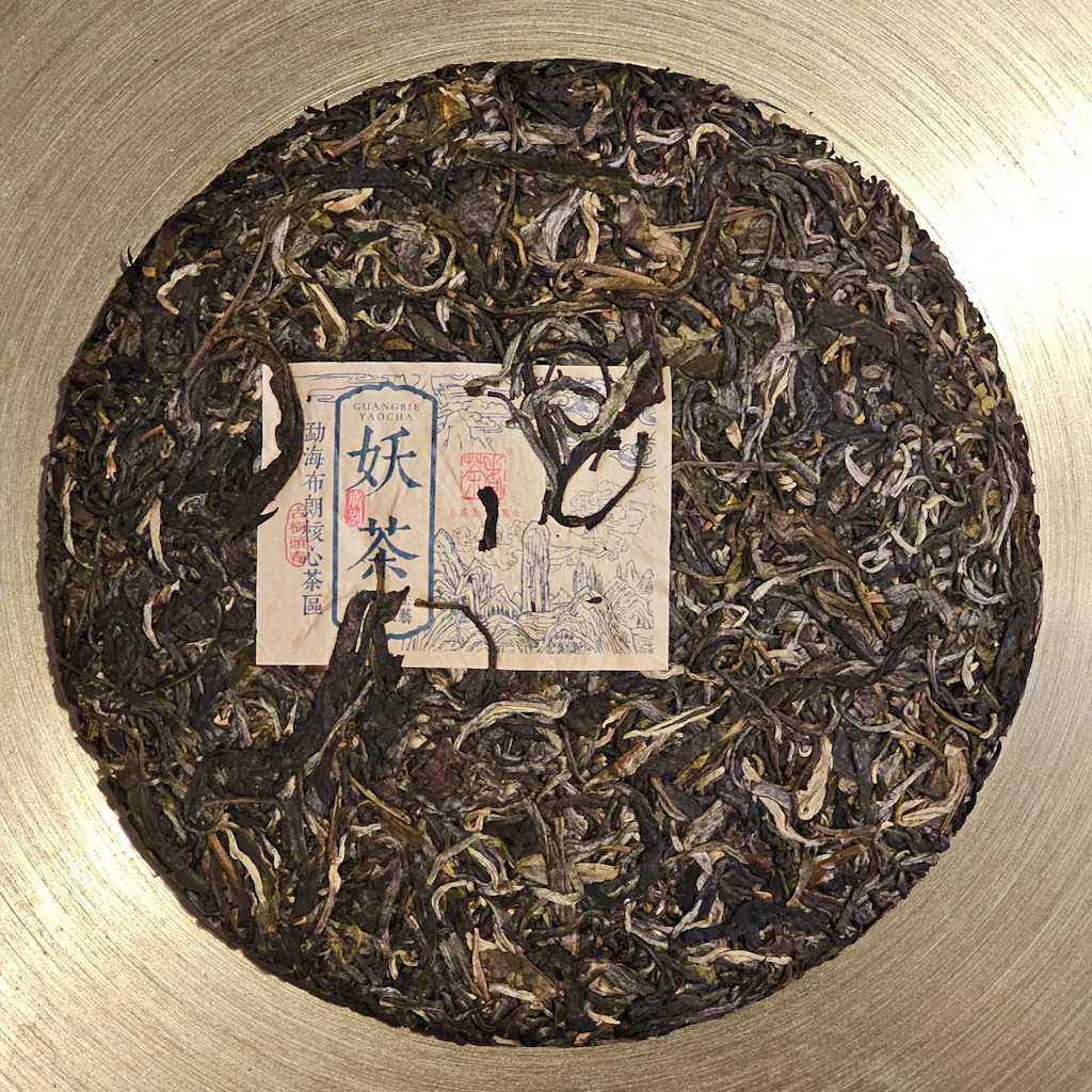 Från hjärtat av Xishuangbanna är denna råa pu erh-kaka från Chaze Factory tillverkad av bladen och knopparna från urgamla träd rotade i Guangbie gamla by, Menghai län.